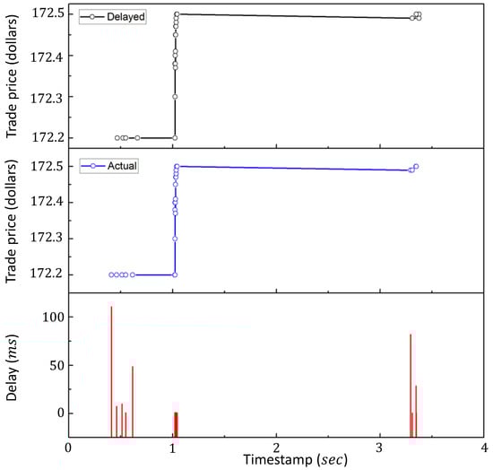 Example of a stock’s trades on the NYSE exchange within a 4 s interval on an otherwise ordinary day. The top panel shows the price of each trade as a function of the delayed reporting time, which is the time information that is publicly available. Middle panel shows the actual time of the trade (i.e., without delay). Bottom panel shows the latency between the actual time and the delayed time.