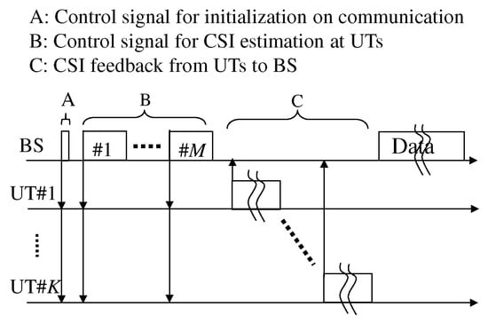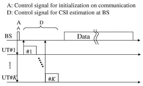 With a view to further improving the frequency utilization of future wireless systems using MU-MIMO transmission, the concept of massive MIMO has recently been proposed [,]. In massive MIMO systems, the number of antennas at the BS is significantly larger than that of the UE and is also significantly larger than the number of UE units. Massive MIMO enables low-complexity signal processing, because the inter-user interference is easily mitigated by the high beamforming resolution []. Generally speaking, estimation of the channel state information (CSI) in MIMO/MU-MIMO systems [] is essential [,]. However, when CSI feedback from the user terminals (UTs) to the BS is employed, a very large overhead occurs compared with the communication data, especially when there are a large number of antennas at the BS [].