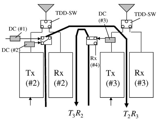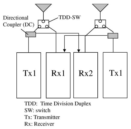 To realize IBF, a calibration technique that compensates for the difference between the complex amplitudes of the transmitters and receivers at the BS is required []. Figure 3 shows the calibration circuit configuration. As shown in this figure, we obtain , where and are the complex amplitudes of the transmitter and receiver, respectively. Because the calibration value required by the kth branch is [], the relative calibration values can be obtained from the circuit shown in Figure 3.