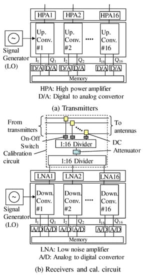 Figure 5 shows the configuration of the testbed used to realize the calibration scheme. The main purpose of this testbed was to clarify the amplitude and phase-error characteristics for a 16-element MIMO system. (–16, –16) can be obtained from a directional coupler (DC) and divider. The number of transmitters is 16, and 16 multi-user transmission is assumed at the maximum. The radio frequency is 2.425 GHz and the bandwidth is 50 MHz. This testbed can be utilized from 400 MHz to 6 GHz by changing the local oscillator in Figure 5.