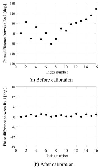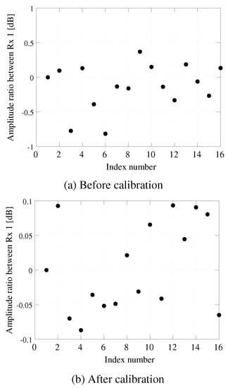 For these measurements, the amplitude and phase errors yielded by the DCs and dividers in Figure 5 were measured in advance and removed. In addition, Figues Figure 6 and Figure 7 show the relative phase and amplitude errors of receiver k Txk against Tx1. As can be seen from Figure 6a, the phase error varied for each transmitter prior to calibration, and these values ranged from to . In contrast, when the calibration circuit in Figure 5 was applied, the phase errors could be eliminated, and these values were reduced to less than . We note that, in addition, we have clarified the transmitter phase errors using the calibration circuit in Figure 5. Similarly, as can be seen from Figure 7, the amplitude errors could be reduced from to using the calibration circuit shown in Figure 5. Therefore, the effectiveness of the hardware in the testbed and the proposed calibration method has been verified.