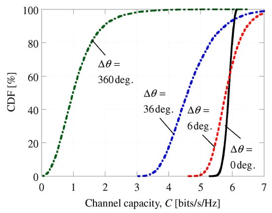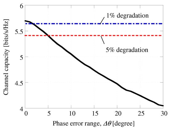 To verify the influence of the phase errors on C, the cumulative density function (CDF) of C for different phase errors and C as a function of the phase-error range are plotted in Figure 8 and Figure 9, respectively; is given by random numbers, and the number of trials is 10,000. We note that the C obtained for a CDF of 10% is plotted in Figure 9. Here, we have assumed that the desired signal and interference have directions of arrival (DoA) of and , respectively. As shown in Figure 8, C decreases even if . Further, as can be seen from Figure 9, C decreases significantly in response to increased . We find that must be reduced to less than () in order to ensure less than 1% (5%) degradation in C. As the calibration reduces to less than (Figure 6), we have, therefore, verified that the degradation in C is less than 1% under our proposed calibration circuit and scheme.