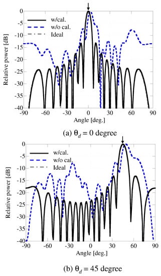 Next, we examine the radiation pattern given by the proposed calibration method using the testbed shown in Figure 5. Figure 10 shows the array patterns reflected by the phase errors in Figure 6. We note that the mutual coupling effect is not considered in Figure 10. The main beam directions in Figure 10a,b are and , respectively, using MRC. As can be seen from this figure, the sidelobe level is very high without calibration, especially in the and directions, because of the phase errors that occur in the absence of calibration. However, Figure 10 also shows that the ideal array pattern can be created when the calibration circuit is employed.