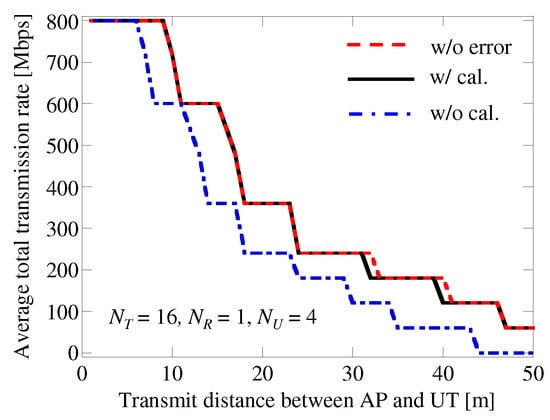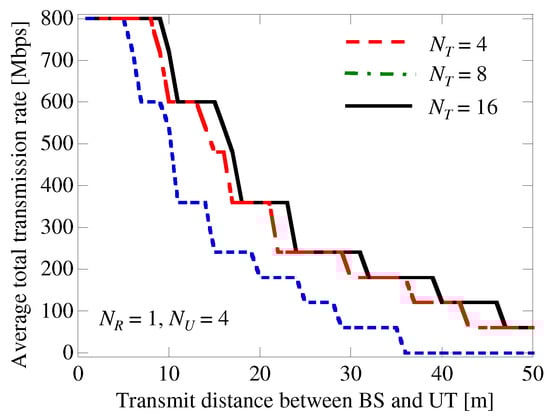 Figure 12 shows the average TR with respect to the transmit distance d between the BS and UT. We note that the calibration error was not considered here, and was set to 4, 8, or 16. A four-user MU-MIMO was assumed, with one antenna at the UT (). As can be seen from Figure 12, the TR and the service area were both increased by the transmit diversity effect when a larger number of antennas were located at the BS. For example, when was increased from 4 to 8 or 16 with , the TR increased by a factor of 2 or 2.5, respectively. Moreover, although the service area was only 35 m when , this increased to more than 50 m when or 16.