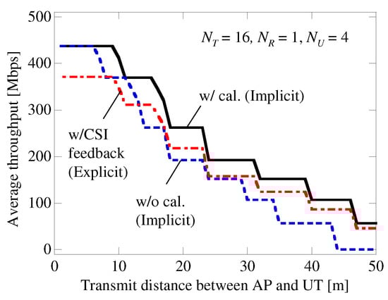 Figure 14 shows the average throughput when the control signals in Table 2 are considered. The results with and without CSI feedback and calibration are given for a data size of 40,000 bytes. When calibration was adopted, the throughput was higher than that with CSI feedback, regardless of the transmit distance; thus, the IBF effect was ideally obtained. However, the throughput without calibration was lower than that with CSI feedback when d was greater than 13 m. Therefore, it is essential to apply IBF with the calibration technique for massive MIMO transmission.