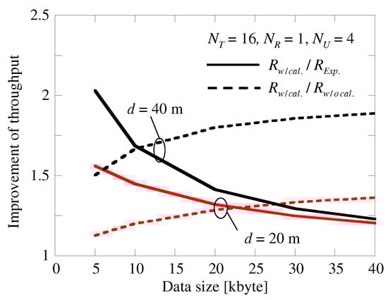 Figure 15 shows the throughput improvement produced by the IBF with calibration for various data sizes. As can be seen from this figure, a large d and relatively small data size produce a higher throughput improvement for CSI feedback (; the latter is the throughput produced by explicit beamforming with CSI feedback). is superior to that without calibration for larger data sizes. We can observe from Figure 15 that the throughput attained by IBF with calibration () is twice that produced by explicit beamforming (with CSI feedback, ) and 1.8 times that given by the IBF without calibration ().
