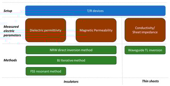 The purpose of this paper is to present an overview of T/R-based methods for the characterisation of a large set of materials by employing standard laboratory measurement equipment. Electric and magnetic polarisations effects of materials are macroscopically described by two well-known parameters, namely the dielectric permittivity and the magnetic permeability. A summary of the methods presented in the paper is displayed in Figure 1. In the second section, the most well-known T/R characterisation procedure for retrieving dielectric permittivity and magnetic permeability of materials, the Nicholson–Ross–Weir [31,32] method (NRW), is presented. The method is easy to use as it allows for retrieving the dielectric permittivity and magnetic permeability from the measured scattering parameters of the unknown sample through a simple analytic procedure. However, the NRW approach presents a number of limitations that have been extensively discussed in the literature [33,34,35], and a number of alternative procedures have been proposed throughout the years [35,36,37,38,39]. The most relevant limitations of the method and some of the most remarkable approaches aimed at overcoming the NRW drawbacks will be presented, with examples. Specifically, particular attention will be dedicated to the possible ambiguities in the determination of the dielectric permittivity and magnetic permeability, which arise in the direct inversion procedure typical of the NRW algorithm [40,41,42]. It will be shown that these limitations can be circumvented by treating the inversion problem as a global optimisation procedure, where only solutions obeying to causal models of materials (Lorentz or Debye models) are searched by using an iterative procedure. This approach will be called Baker–Jarvis (BJ) method [36]. Another useful technique to characterize the dielectric properties of thin low-dielectric permittivity materials based on resonant FSS filters in waveguide environment will also be discussed [43]. The third section is dedicated to the characterisation of thin two-dimensional materials with non-negligible conductivity. Moreover, the cases where the sheet impedance approximation is valid will be discussed. If the sheet impedance condition is verified, the 2D material can be characterised in terms of complex sheet impedance instead of using bulk parameters such as the complex dielectric permittivity. Afterwards, a characterisation approach employing the same waveguide experimental setup [44,45,46] to derive the surface impedance of the sample is presented.