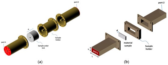 One of the most popular procedures for the EM characterisation of materials is the Nicolson–Ross–Weir (NRW) method, based on T/R measurements of the specimen under test. The properties of materials are retrieved from their impedance and the wave velocities in the materials. It is well known that the main drawback of this method is related to the electrical thickness of the analysed material [40]. In particular, when the thickness of the specimen is an integer multiple of half wavelength in the material, the method produces ambiguous results due to the 2π periodicity of the phase of the EM wave. In principle, from a priori information regarding the specimen, it is possible to achieve unambiguous results. In addition, as will be presented in this section, because of the inversion procedure adopted for the extraction of the EM parameters, the NRW method is not accurate in the case of low reflecting materials or thin samples. Two examples of transmission lines for the material characterisation are reported in Figure 2. The sample under test with thickness d is located inside a two-port microwave device such as a coaxial cable (Figure 2a) or a waveguide (Figure 2b).