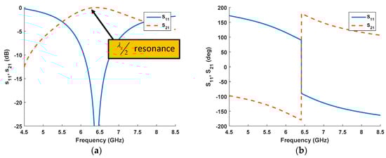 An example of an application of the NRW procedure for the characterisation of a dielectric material is reported hereinafter. A material sample with thickness equal to 8 mm and εr = 9 − j0, µr = 1 − j0 is considered. The transmission and reflection coefficient simulated with a transmission line model are reported in Figure 3.