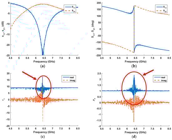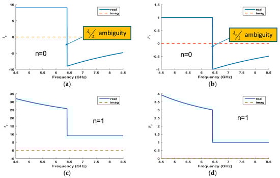 The application of the NRW with n = 0 provides the results reported in Figure 4a,b. As is evident from the graphs displayed in Figure 4, when the thickness of the sample is equal to half a wavelength in the dielectric media (λg/2) the NRW method produces ambiguous results. In this particular case, the thickness of the sample is equal to λg/2 at 6.4 GHz:
