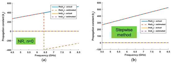 The real and imaginary parts of the propagation constant characterised with the NRW (n = 0) and stepwise method are reported in Figure 5a,b, respectively.