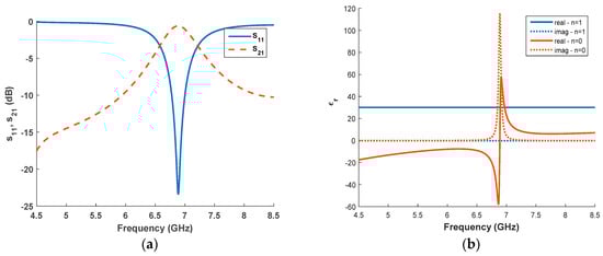 (a) Scattering parameters for a sample of εr = 30 − j0.2, µr = 1 − j0 with d = 8 mm; (b) estimated dielectric permittivity for n = 0 and n = 1.