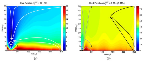 Representation of the convergence of the algorithm on the complex space of the dielectric permittivity. The searched values are (a) εR = 20 − j10 and (b).εR = 6.15 − j0.0184.