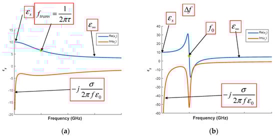 The real and imaginary part as a function of the frequency of the electric permittivity in the case of the Debye (a) and Lorentz (b) models are reported in Figure 9a,b, respectively. It is worth underling that, in the iterative process, five parameters need to be estimated for Lorentz’s model. These parameters are highlighted in Figure 9b. Similarly, the estimation of four parameters is required for Debye’s model, as reported in Figure 9a.