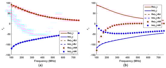 Real and imaginary parts of the dielectric permittivity estimated with NRW and the iterative method employing the Debye dispersion model with μr = 1 for the case of a dielectric sample with thickness equal to 10 cm (a) and 15 cm (b). In this case, the processed data are not affected by noise.