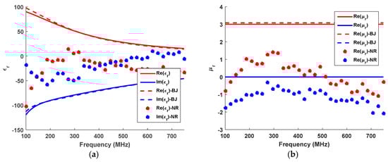 Real and imaginary parts of the (a) dielectric permittivity and (b) magnetic permittivity estimated with NRW and the iterative method (BJ) employing the Debye dispersion model with μr = 3 for the case of a dielectric sample with thickness equal to 10 cm. In this case, the processed data are affected by AWGN noise with mv = 0 and σ = 0.01.