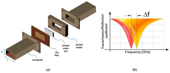 (a) Resonant measurement setup in a waveguide based on FSS filters; (b) estimation principle.