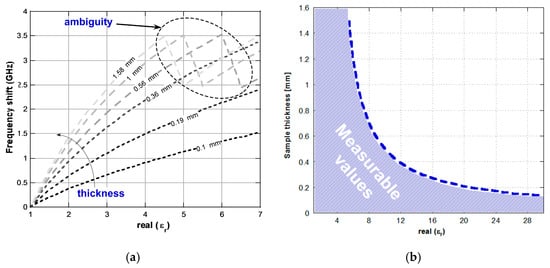 (a) Shift-permittivity map: unknown dielectric permittivity as a function of the frequency shift of the resonant peak; (b) maximum value of the measurable dielectric permittivity as a function of the sample thickness.