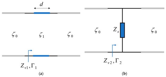 where Z0 and Z1 are the transmission line’s characteristic impedances in absence and in the presence of the sample, respectively. The expression of Z1 can be straightforwardly derived from Equation (2) as follows:
