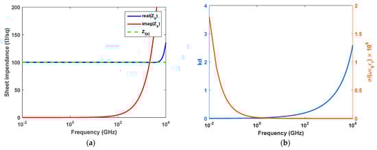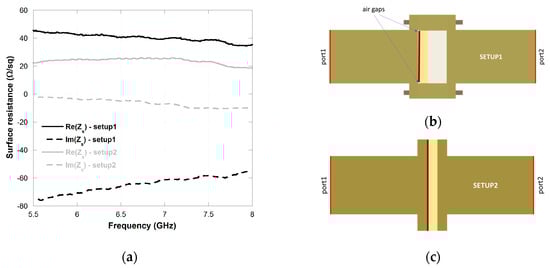 It is worth underlining that only a solution of Equation (36) with a positive real part is acceptable. After the derivation of the calibration parameters, the scattering matrix in presence of the sheet S′ (and the same dielectric stack-up) is obtained through a second measurement. Consequently, the sheet impedance Zs can be obtained as: