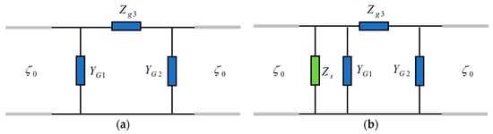 According to [45], the values of the lumped components describing the junction can be computed by using the scattering parameters of the junction S without the impedance sheet (Figure 19a) as follows: