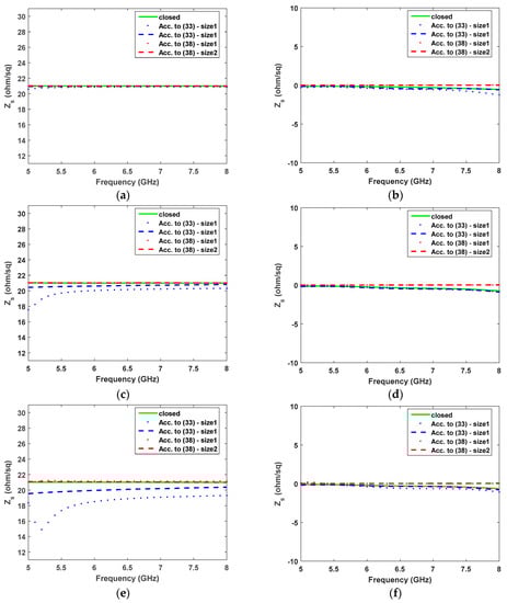 Estimated surface impedance (real and imaginary part) for three different thicknesses of the substrate: Zs was set to 20 + j0 in the simulations performed with Ansys Electronics v. 16. Closed: sample entirely contained in a closed waveguide. Size 1: Δx = 2 mm, Δy = 2 mm, Size 2: Δx = 6 mm, Δy = 4 mm. (a,b) d = 0.5 mm, (c,d) d = 1.5 mm, (e,f) d = 2.5 mm.