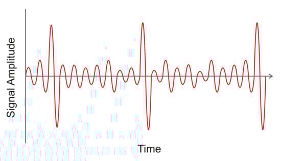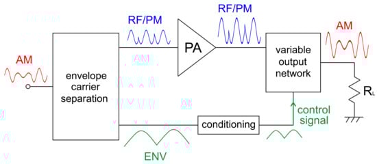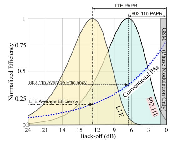 Current communication standards can offer high data rates in a limited frequency band thanks to the use of spectrally-efficient complex modulation schemes. Signals adopting such modulations are characterized by a very high Peak-to-Average Power Ratio (PAPR), meaning that the time domain waveform presents rare peaks significantly higher than the average value, as shown in Figure 1. The PA efficiency is determined by the average output power. However, not to compromise the quality of the carried information, the PA must be also highly linear, introducing limited distortion on the output signal. Practically, the PA must not clip the signal peaks, meaning that the maximum output power of the PA must be around PAPR times larger than the average one. Crest-reduction techniques [11,12,13] can be applied to partially overcome this limit, at the cost of an increased non-linear behaviour.