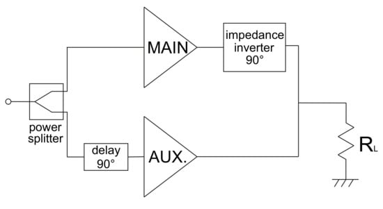 Note that the IIN introduces a 90 phase difference, which must be compensated for in order to maintain the proper phase relation between and and sum them constructively at the output. This is typically done either inserting a 90 delay line at the input of the Auxiliary amplifier (as in Figure 4) or adopting a hybrid 90 coupler as the input power splitter.