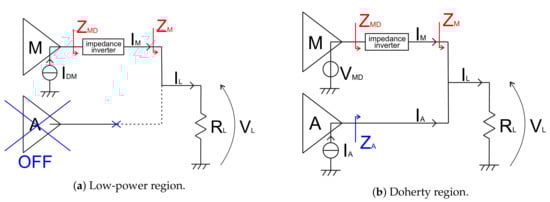 The DPA behaviour can be therefore split into two different regions: (1) the low-power region where the Auxiliary device is off and (2) the Doherty region where both devices are on. The simplified output section of a DPA in the two operating regions is depicted in Figure 5. Active devices in common-source configuration behave in first approximation as current sources up to saturation. In the low-power region (Figure 5a), ideally, only the Main device is contributing to the output, while the output impedance of the Auxiliary device is an open circuit. The efficiency increases as power increases as for a Class-AB PA (Figure 6, red curve). At the break point, the Main device drain voltage reaches its maximum swing and cannot increase any further, and the Auxiliary turns on. In the Doherty region (Figure 5b), both PAs contribute to the output power. The impedance seen from the output section of each branch is increased by the current contribution of the other stage:
