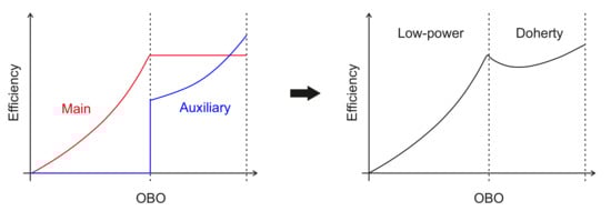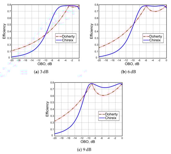 Under such a condition, the load trajectories of the two branches cross the real axis for as shown in Figure 12b, which results in an OBO efficiency peak as shown in Figure 13, which reports the efficiency curves versus OBO for different values of the compensating susceptance, i.e., for different HEPRs. These curves are theoretically derived by analysing the simplified Chireix equivalent of Figure 11b and assuming perfectly sinusoidal output voltages along with half-rectified sinusoidal drain currents. It is to be noted that the compensating susceptance also changes the position of the high-power efficiency peak, which is no more at 0 dB OBO.