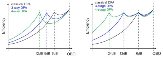 An alternative approach for the HEPR issue is the multi-way/multi-stage DPA architecture [40,41,42,43]. The multi-way DPA, or N-way DPA, is a variant of the asymmetrical DPA where the single Auxiliary stage is replaced by parallel devices that turn on simultaneously, realizing an equivalent larger Auxiliary device, overcoming the issues related to the adoption of single very large devices. The efficiency, however, suffers a sensible drop in the Doherty region as shown in Figure 7, left. The multi-stage DPA, or N-stage DPA, replicates the Doherty concept in a cascade configuration: it also has Auxiliary stages, but they turn on separately, following a precise scheme, in order to provide N efficiency peaks and Doherty regions as shown in Figure 7, right. The main drawback of both of these solution is the increased circuit complexity, requiring N-way splitting circuits and complex output power combining networks, especially in the case of the N-stage DPA.