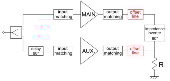 The most common solution to restore optimal load-modulation behaviour is the offset lines technique, introduced in [54] and depicted in Figure 8. In [53,55], it is demonstrated how the insertion of two transmission lines, with characteristic impedance equal to the load impedance at saturation and of proper length, placed at the output of both the Main and Auxiliary devices, can improve load modulation, and thus both linearity and efficiency. In particular, the offset line at the output of the Auxiliary amplifier forces the necessary almost-ideal open-circuit condition at low power levels, while the one at the output of the Main stage keeps under control the load matching within the whole Doherty region, thus maximizing the power efficiency.