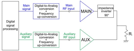 Recent developments of Digital Signal Processing (DSP) and Digital-to-Analogue Conversion (DAC) techniques make increasingly attractive mixed-signal solutions previously considered unfeasible. In this framework the digital DPA is emerging as a promising solution able to overcome the typical issues of the analogue DPA [90]. In a digital DPA, two separate Radio Frequency (RF) inputs for the Main and Auxiliary amplifier are separately generated and controlled for optimized DPA performance, as shown in Figure 9, hence the alternative name of dual-input DPA.