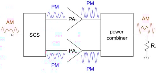 - Perreault, D.J. A New Power Combining and Outphasing Modulation System for High-Efficiency Power Amplification. IEEE Trans. Circuits Syst. I 2011, 58, 1713–1726. [Google Scholar] [CrossRef]