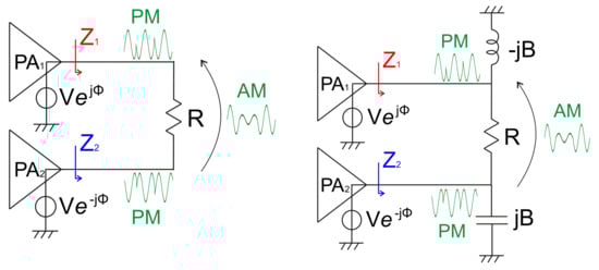 To explain the load modulation effect in a Chireix outphasing PA, the simplified circuit of Figure 11a is considered. It represents the output section only of the Chireix PA where the two amplifiers are replaced by ideal voltage sources, feeding signals with equal amplitude V and opposite phase () into a differential load R connected in series between them. Each PA varies the load seen by the other according to the value of the outphasing angle as: