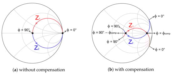 The load trajectories in Figure 12a cross the real axis only for and , while for all other values of the outphasing angle, both load impedances show a significant imaginary part. As a consequence, the overall efficiency decreases with , yielding no substantial improvement to back-off efficiency. A second efficiency peak can be forced at a defined OBO level, by adding two shunt-compensating reactive elements, with equal and opposite susceptance , as in Figure 11b, that resonate out the equivalent susceptance seen by each amplifier for a specific value of the outphasing angle , i.e.,
