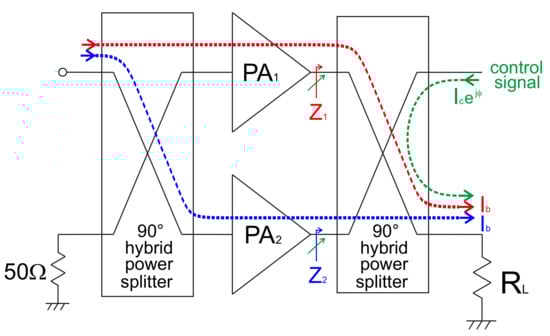 An alternative method to compensate for parasitic effects, which is nowadays often preferred to offset lines, is the co-design of the device output matching networks and output combiner, where the correct load modulation is imposed as an additional constraint for circuit optimization [56,57,58]. This approach has the advantage of reducing the circuit size. On the other hand, the offset lines technique enables one to easily insert already existent PAs in a Doherty configuration. Both of these techniques are compatible with wide-band applications. Bandwidth enhancement is obtained by means of dual-band offset lines in [59] and with a wide-band output compensator in [27]. More recently, the co-design technique has been further enhanced by adopting a black-box approach for the entire output combiner, thus eliminating the limitation imposed by the presence of the quarter wavelength impedance inverting network. In this way, the phase difference between the two branches becomes an additional degree of freedom and can be optimized in order to achieve better efficiency and linearity, as in [60], to enhance HEPR as in [48], or to improve the bandwidth as described in [61], where the analytical analysis of this novel approach is introduced, presenting a technique for wide-band power combiners’ design that can be applied both to Doherty and to Chireix PAs (Section 4).
