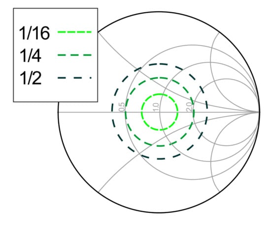 When , the output power is maximum and a purely resistive load () is seen by both PAs. When , the output power is null and the loads are two open circuits. For intermediate power levels, the load impedance of the two branch PAs moves along a constant resistance semicircle as shown in Figure 12a.