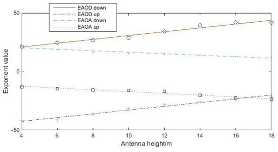 - For the PDF of EAoA: the logarithm exponent value λ′1EAoA decreases rapidly when the antenna height is lower than half of the building’s height and then varies slightly. However, the logarithm exponent value λ′2EAoA is almost stable when the antenna height is lower than half of the building’s height, but has a significant drop when the antenna height increases.