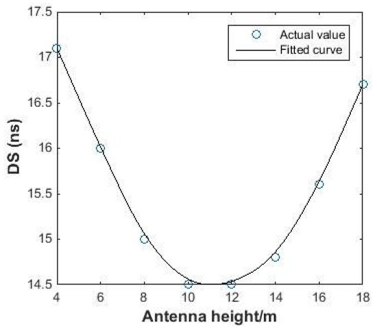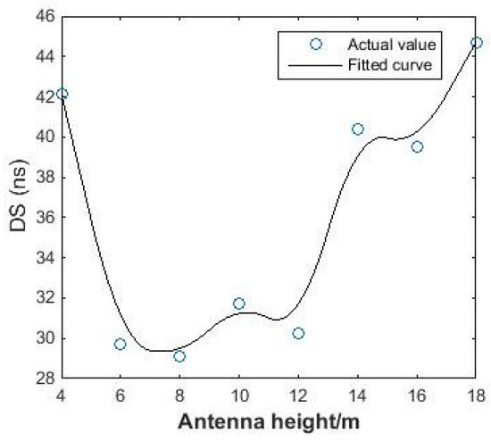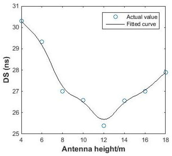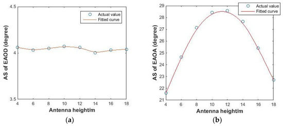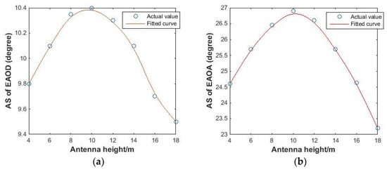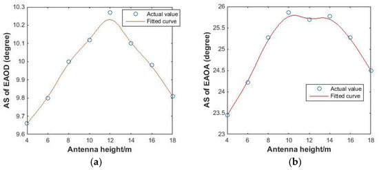 - For the PDF of EAoD: the logarithm exponent value λ′1EAoD reduces rapidly when the antenna height is lower than half of the building’s height, and gains the minimum value at 14 m, and then the value remains the same. In contrast, the logarithm exponent value λ′2EAoD is nearly unchangeable when the antenna height is lower than half of the building’s height, but has a dramatic decrease when the antenna height grows.