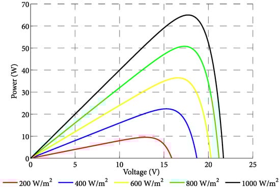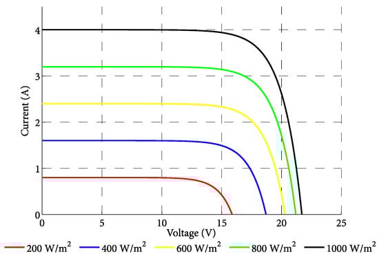 Figure 1 and Figure 2 show the I-V and P-V curves that are obtained with the electric model of the PV module in Simulink, with variable irradiation and constant temperature of 25 °C. For this purpose, irradiation and temperature were used as inputs, while current and voltage were used as outputs.