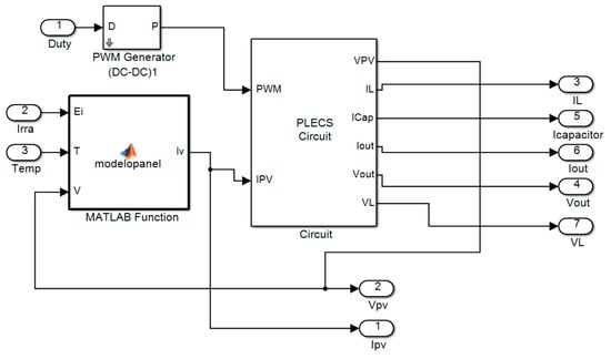 where the inductor current ripple was calculated using Equation (5) and the value obtained for L in Equation (11). Figure 4 shows the model of the buck converter implemented in Simulink with the Plecs blockset, for which a current source that generates a voltage in the input capacitor was used. Figure 5 shows the model in Simulink of the PV module with the buck converter.