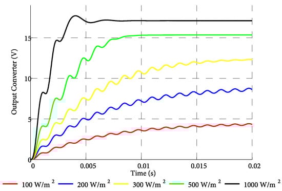 Figure 6 shows the voltage response of the converter for a duty cycle D = 0.9, resistive load of 10 Ω, constant temperature of the PV module of 25 °C, and dynamic values of irradiation between 100 and 1000 W/m2.
