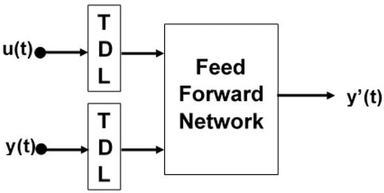 A NARX was trained, which can be mathematically defined, as shown in Equation (13); where u(t) and y(t) are the input and the output of the network at time t. Generally, a NARX has a hidden layer with hyperbolic tangent activation function, an output layer with linear activation function and two tapped delay line (TDL) [,]. See Figure 7.