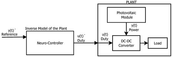 The inverse control method was used to ensure maximum power transfer from the PV module to the battery. With this control technique, the dynamic of the plant is canceled by introducing an element between it and the input signal. The simplest strategy to implement the inverse control with artificial neural networks (ANNs) is the direct inverse model, in which an ANN is placed between the reference signal and the plant [].