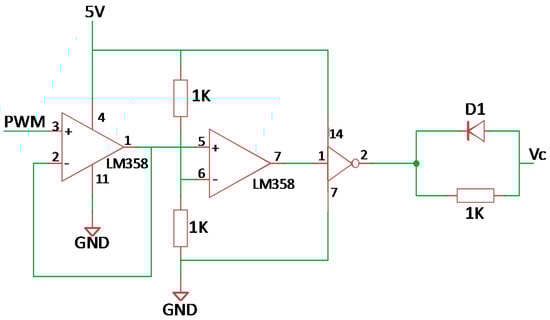 The converter was implemented in two stages. The first stage conditions the PWM signal from the Arduino board, compares it with a reference voltage level and generates a square output with a CMOS inverter gate activated by Schmitt Trigger. See Figure 11.
