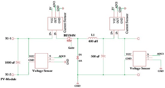 Figure 13 shows the schematic diagram of the dc-dc converter implemented. To measure the current of the PV module and the battery, two hall effect current sensors ACS712 (Allegro MicroSystems, Worcester, MA, USA) of 30 A were used. To measure the voltage, two E3-01M-1 modules (Vistronica, Fusagasugá, Colombia) were used, which are responsible for regulating voltages from 25 V to 5 V. See Figure 14.