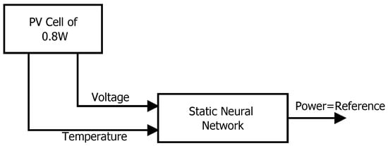 It was necessary to carry out the acquisition of a reference signal to obtain a duty cycle for the MPPT. In order to reduce costs, a static neural network was used to generate the reference signal, which has as inputs the temperature and voltage of a PV cell of 0.8 W and as output the maximum power obtained from the PV module. In this way, it was possible to acquire the reference signal. See Figure 15.