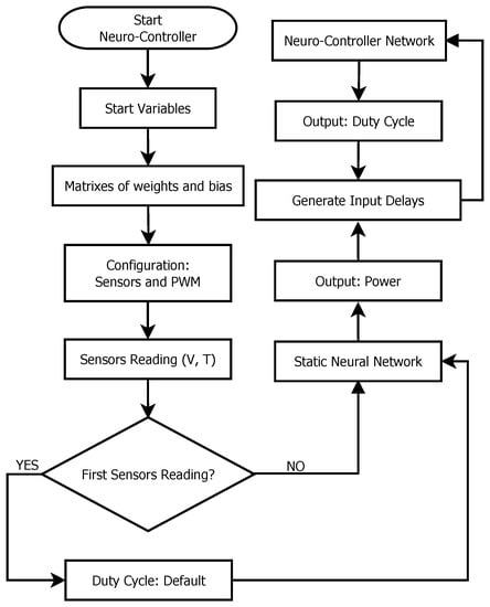 Figure 16 shows the flow diagram of the inverse neural controller that was implemented using the low cost Arduino board. Table 2 shows the main specifications of the Arduino Mega board used, which is based on the ATmega 2560 (Microchip, Chandler, AZ, USA) microcontroller [].