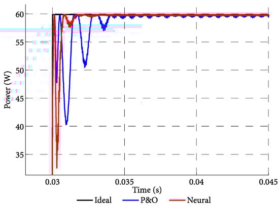 Figure 19 shows the output power of the PV module for the inverse neural controller and the P&O algorithm, using a constant temperature of 50 °C and a change in irradiation of 100 to 1000 W/m2. It can be observed that the neural controller is more efficient when compared to the P&O, since it eliminates the oscillations around the operating point and presents a better time response. The neuronal controller stabilizes in a time of 0.032 s, while the P&O decreases oscillations in a time of 0.034 s; however, it does not eliminate them completely.